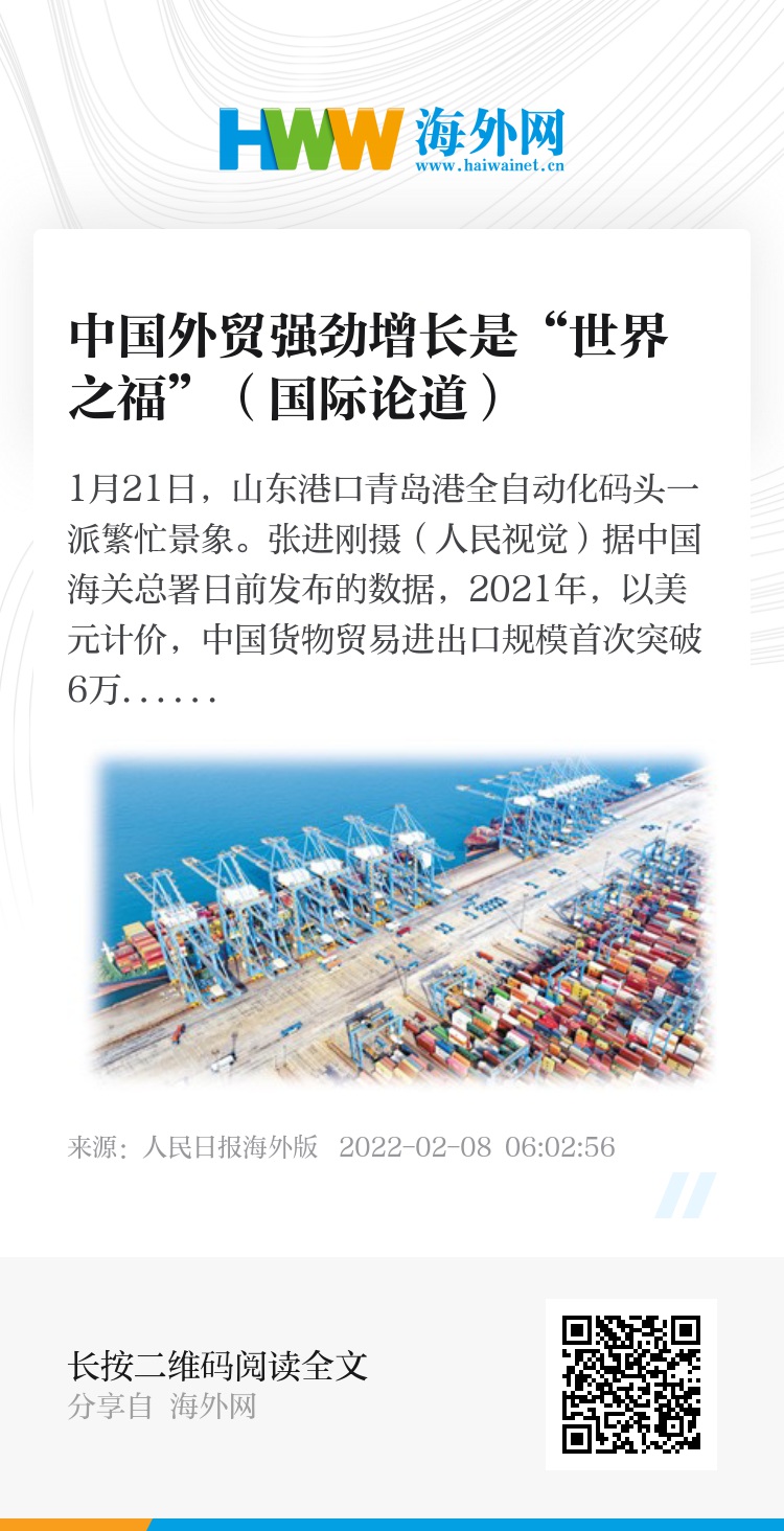 “中国2021年稳外贸效果好于预期。”《华尔街日报》称,以美元计,中国2021年出口同比增长29.9%,进口同比增长30.1%。新冠肺炎疫情暴发两年来,作为不断创造惊喜的“优等生”,中国外贸成为中国经济平稳运行的重要担当。这些数据充分证明中国经济及中国产业链供应链的韧性。