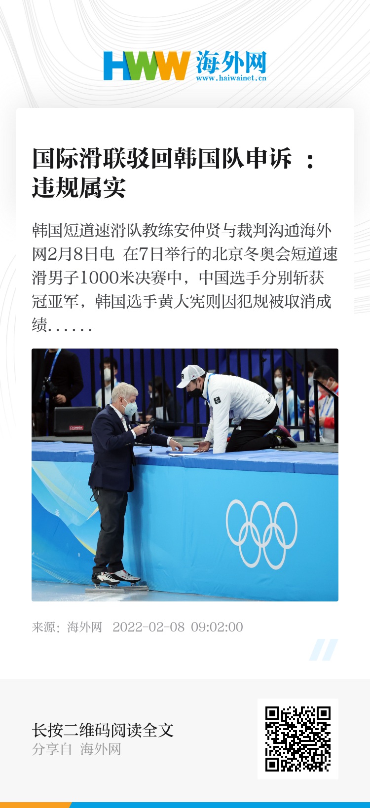 海外网2月8日电 在7日举行的北京冬奥会短道速滑男子1000米决赛中,中国选手分别斩获冠亚军,韩国选手黄大宪则因犯规被取消成绩。韩联社称,对此,韩方称遭遇“不公正判罚”,并提出申诉。8日,国际滑联驳回韩方申诉,理由是违规属实,判罚没问题。同时也驳回了匈牙利队对刘少林被判罚的申诉。