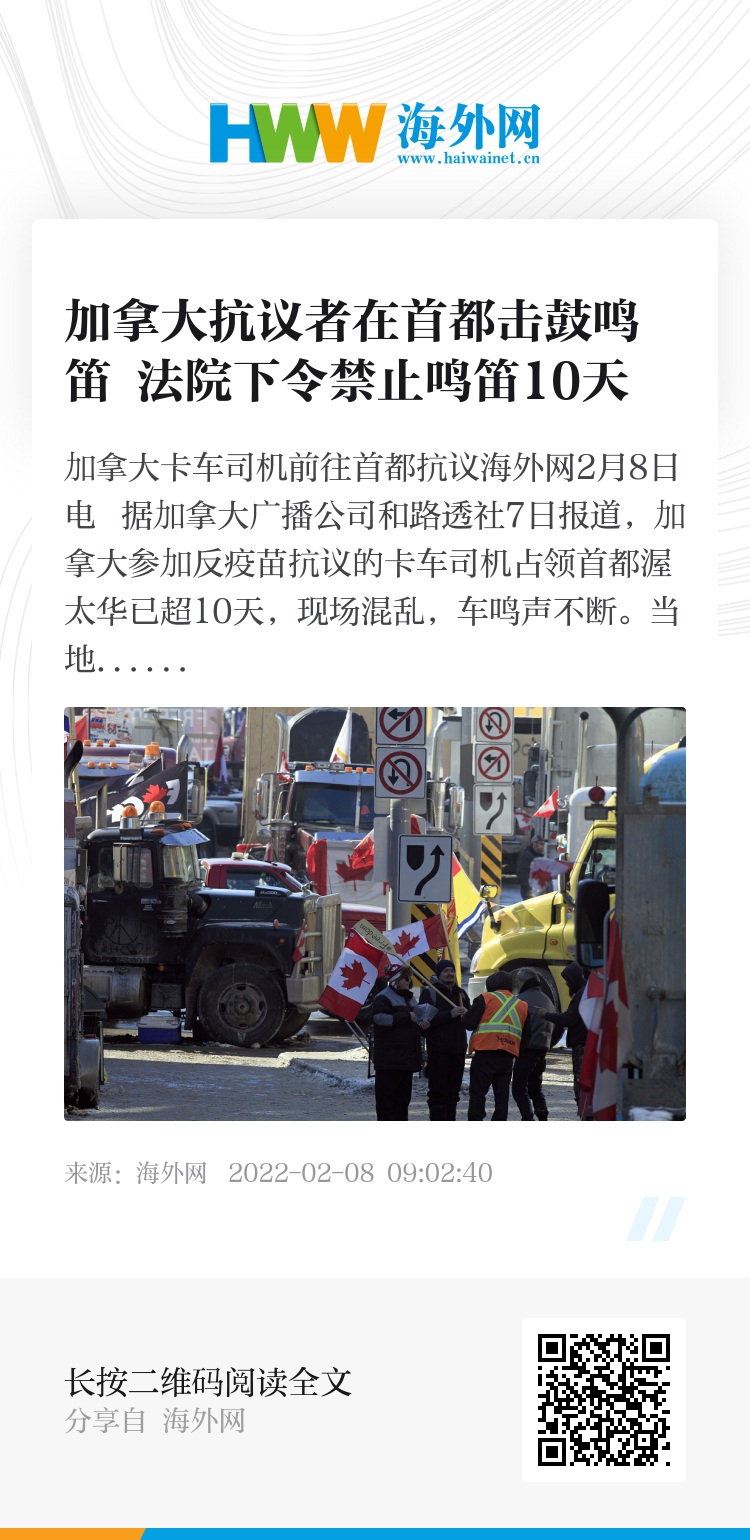 海外网2月8日电 据加拿大广播公司和路透社7日报道,加拿大参加反疫苗抗议的卡车司机占领首都渥太华已超10天,现场混乱,车鸣声不断。当地法院7日批准一项临时禁令,规定市区内10天禁止鸣笛。