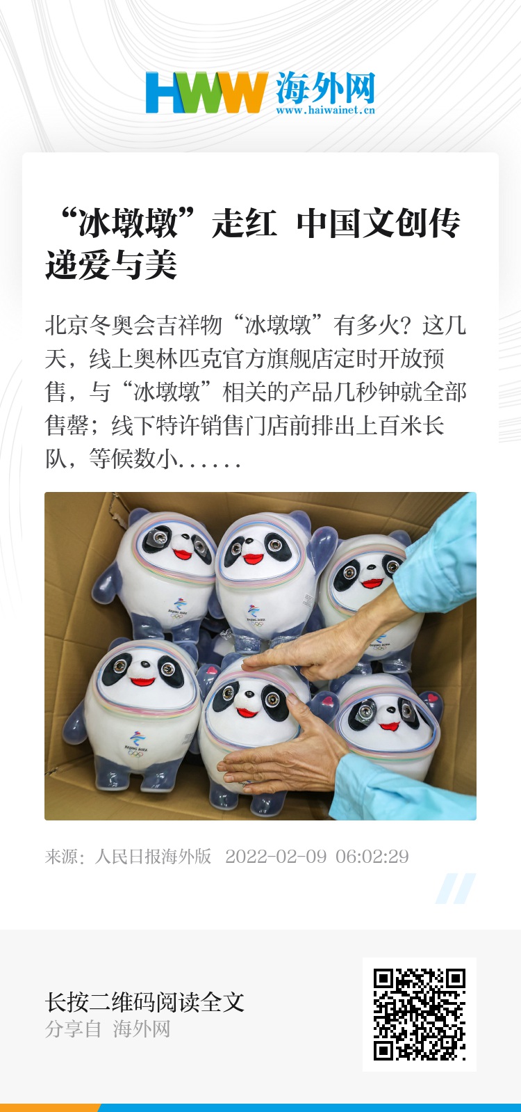 “冰墩墩”走红背后,是全世界对北京冬奥会的热切关注。中国人争先恐后购买“冰墩墩”,是对冬奥盛会的热情支持,也是参与冬奥的一种方式;各国来客喜欢和爱上“冰墩墩”,折射出中国文化和北京冬奥会的巨大魅力。