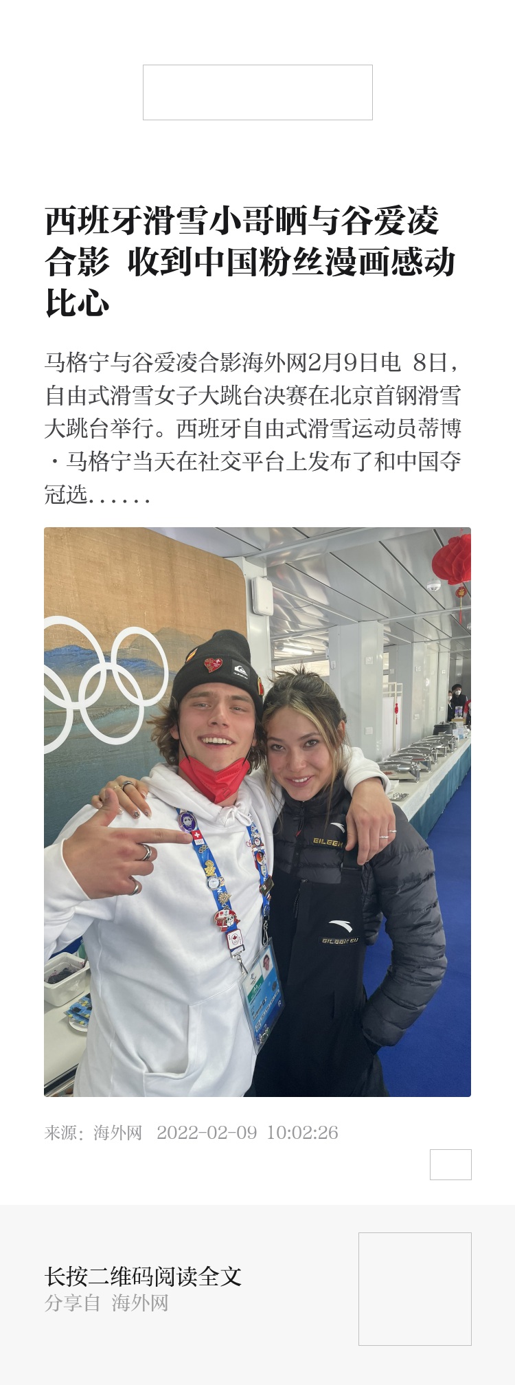 海外网2月9日电 8日,自由式滑雪女子大跳台决赛在北京首钢滑雪大跳台举行。西班牙自由式滑雪运动员蒂博·马格宁当天在社交平台上发布了和中国夺冠选手谷爱凌的合影,称其为滑雪“女王”。他还晒出中国粉丝送给自己的漫画,用中文表达感谢,直呼“我爱你”。