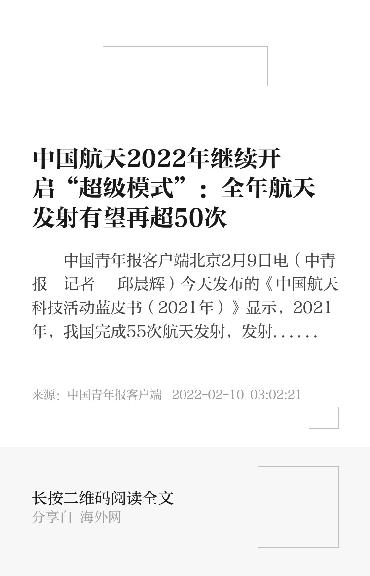 中国青年报客户端北京2月9日电(中青报・中青网记者 邱晨辉)今天发布的《中国航天科技活动蓝皮书(2021年)》显示,2021年,我国完成55次航天发射,发射次数居世界首位;发射航天器117个,居世界第二;发射载荷总质量191.19吨,发射载荷数量和质量持续刷新纪录。