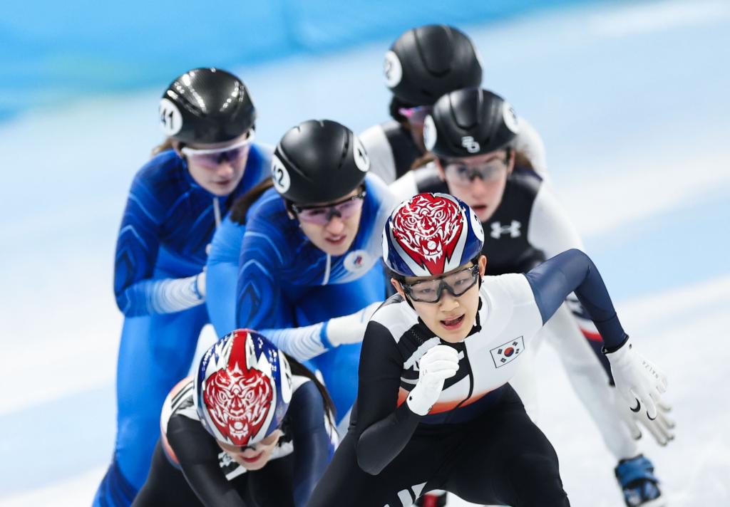 2月9日,韩国队选手徐辉旻(前)在比赛中。韩国队以4分5秒904的成绩晋级A组决赛。当日,北京2022年冬奥会短道速滑项目女子3000米接力半决赛在首都体育馆举行。新华社记者 兰红光 摄