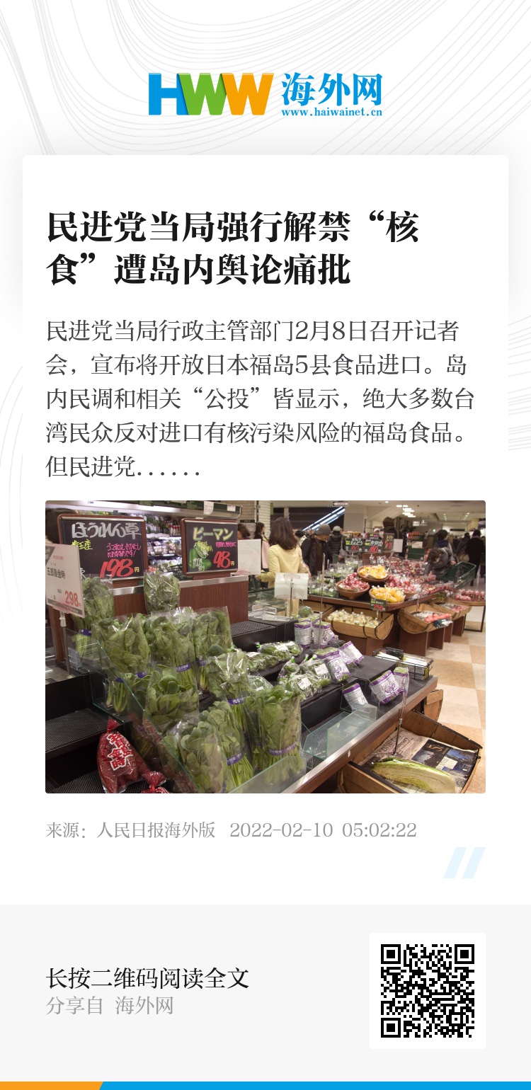 然而,岛内民众的反对声浪对民进党当局来说只是耳旁风。春节假期后开工才第二天,民进党当局就闪电式召开记者会,宣布除了福岛5县的野生鸟兽肉、菇类与漉油菜仍禁止进口外,其他福岛食品都将开放进口,新制最快将于2月底生效。