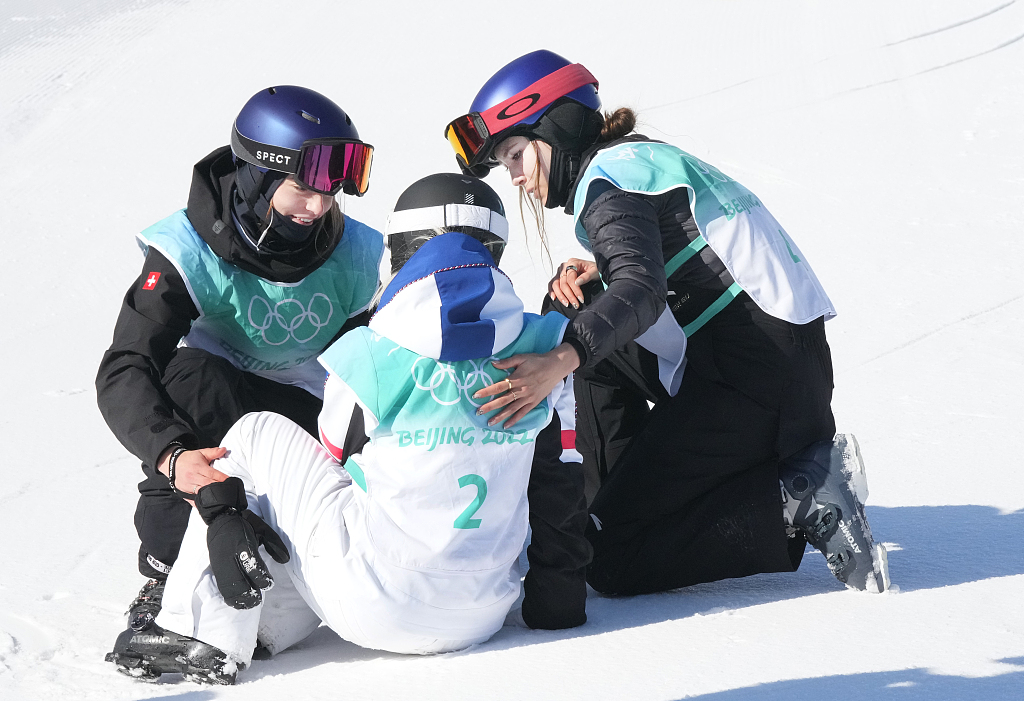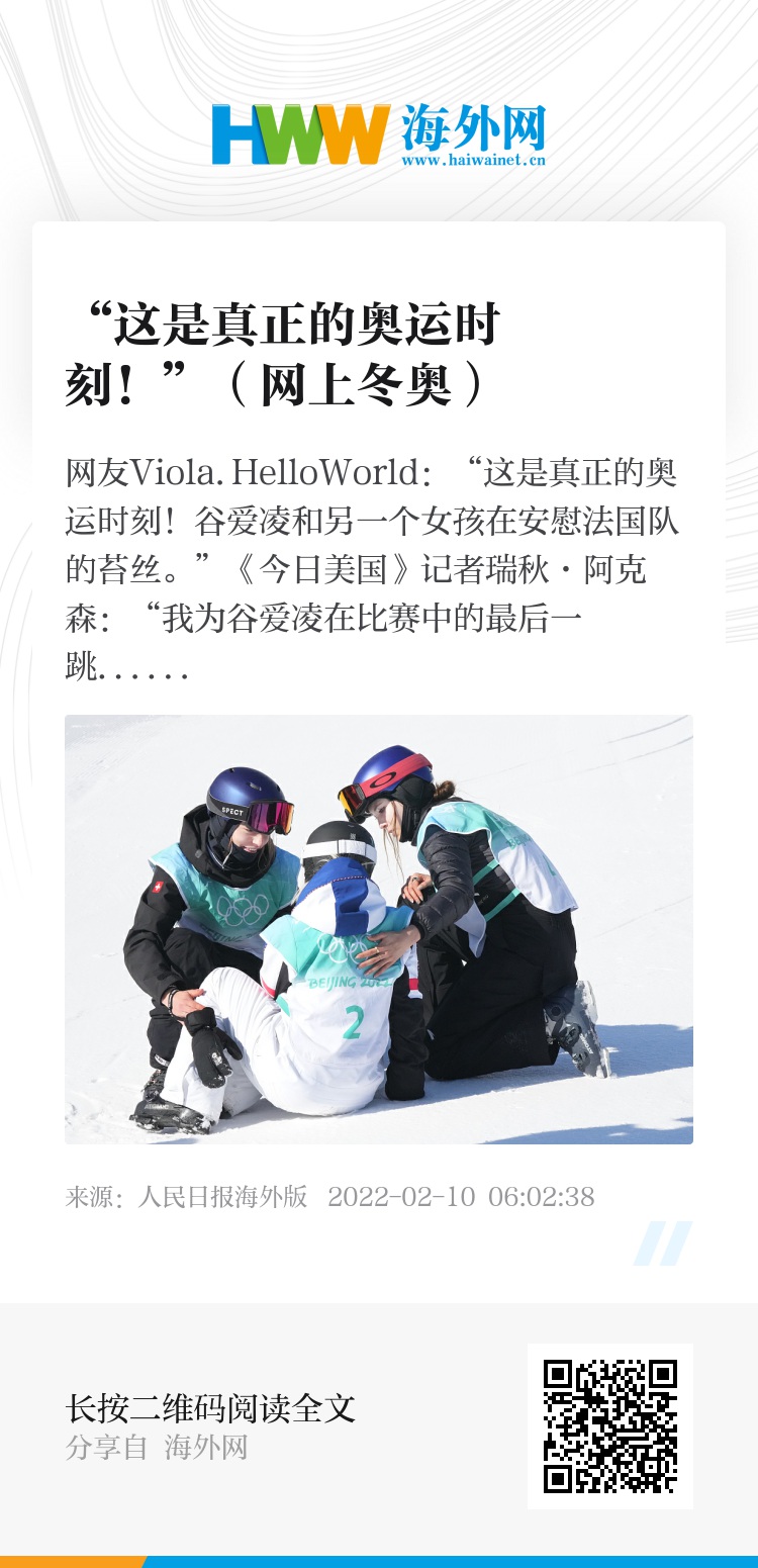网友Viola.HelloWorld:“这是真正的奥运时刻!谷爱凌和另一个女孩在安慰法国队的苔丝。”