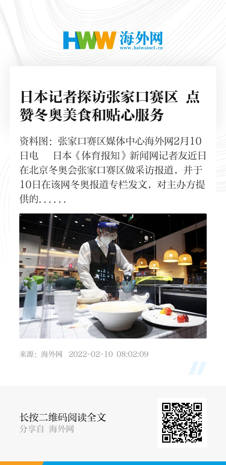 海外网2月10日电 日本《体育报知》新闻网记者友近日在北京冬奥会张家口赛区做采访报道,并于10日在该网冬奥报道专栏发文,对主办方提供的美食和贴心服务称赞不已。