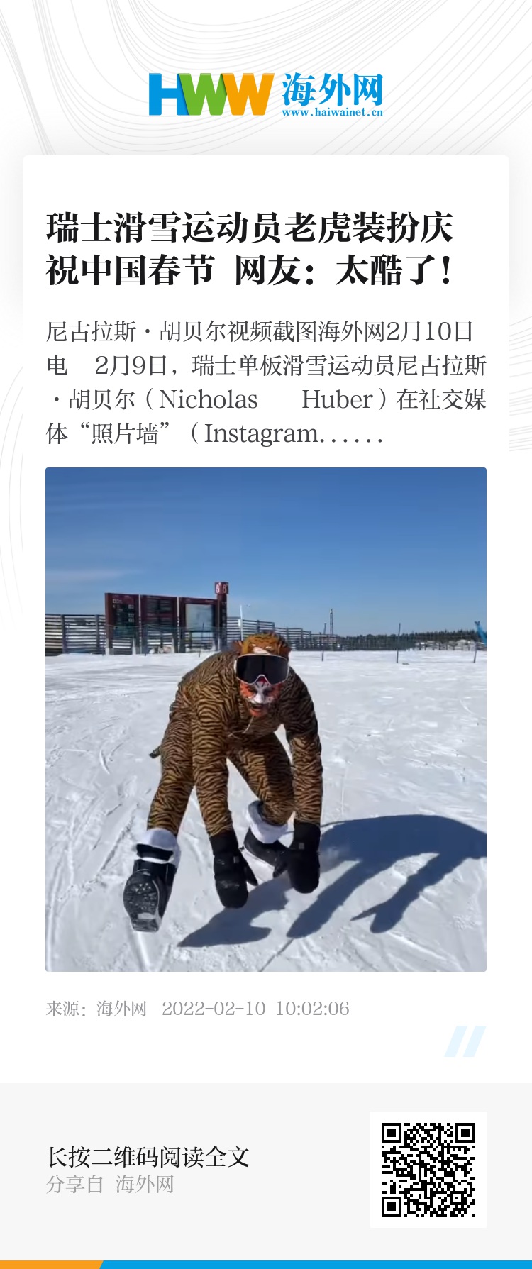海外网2月10日电 2月9日,瑞士单板滑雪运动员尼古拉斯·胡贝尔(Nicholas Huber)在社交媒体“照片墙”(Instagram)上发布一条视频,以老虎装扮出境,庆祝中国农历虎年新春。