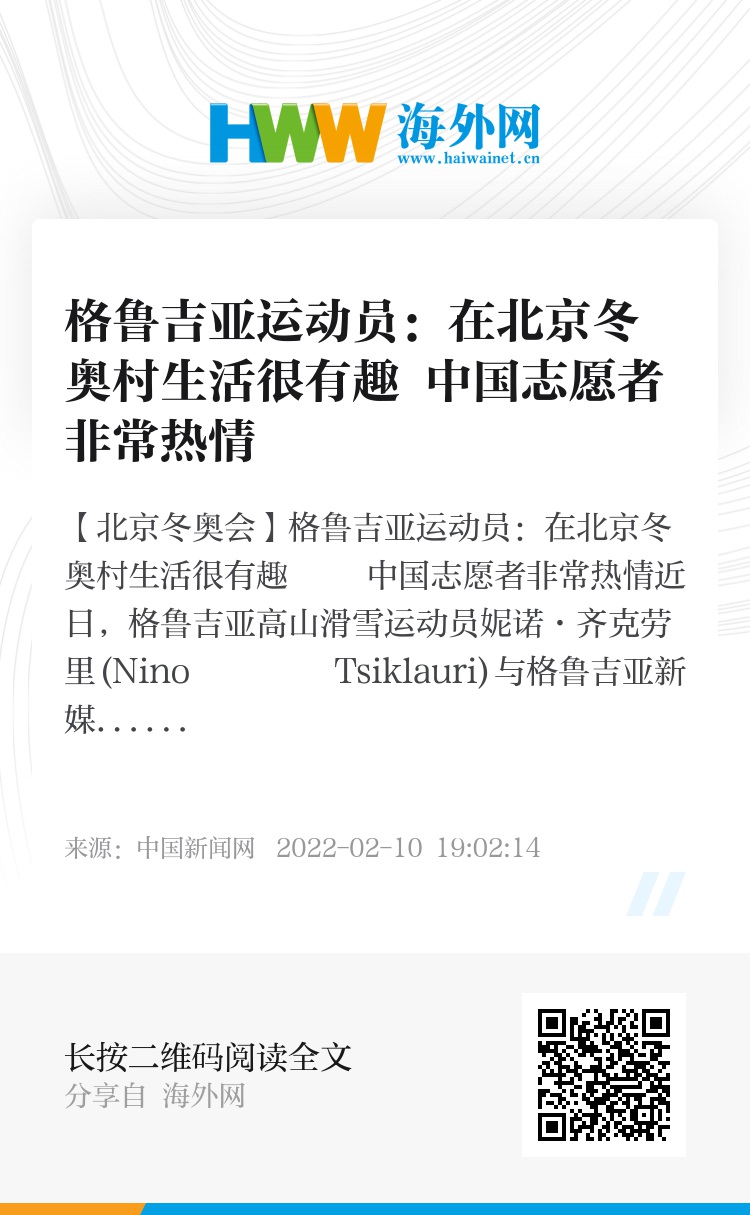 被问及在北京冬奥村生活是什么感觉,齐克劳里说,“非常有趣!因为不同领域的运动员都住在同一个地方,我们可以见到很多奥运冠军和世界冠军,可以和他们一起训练。这对我们来说很有帮助,大家都非常友好,我们可以互相学习,这种感觉非常好。”(制作 吕慧乾 视频来源 @格鲁吉亚Tamo桃漫)