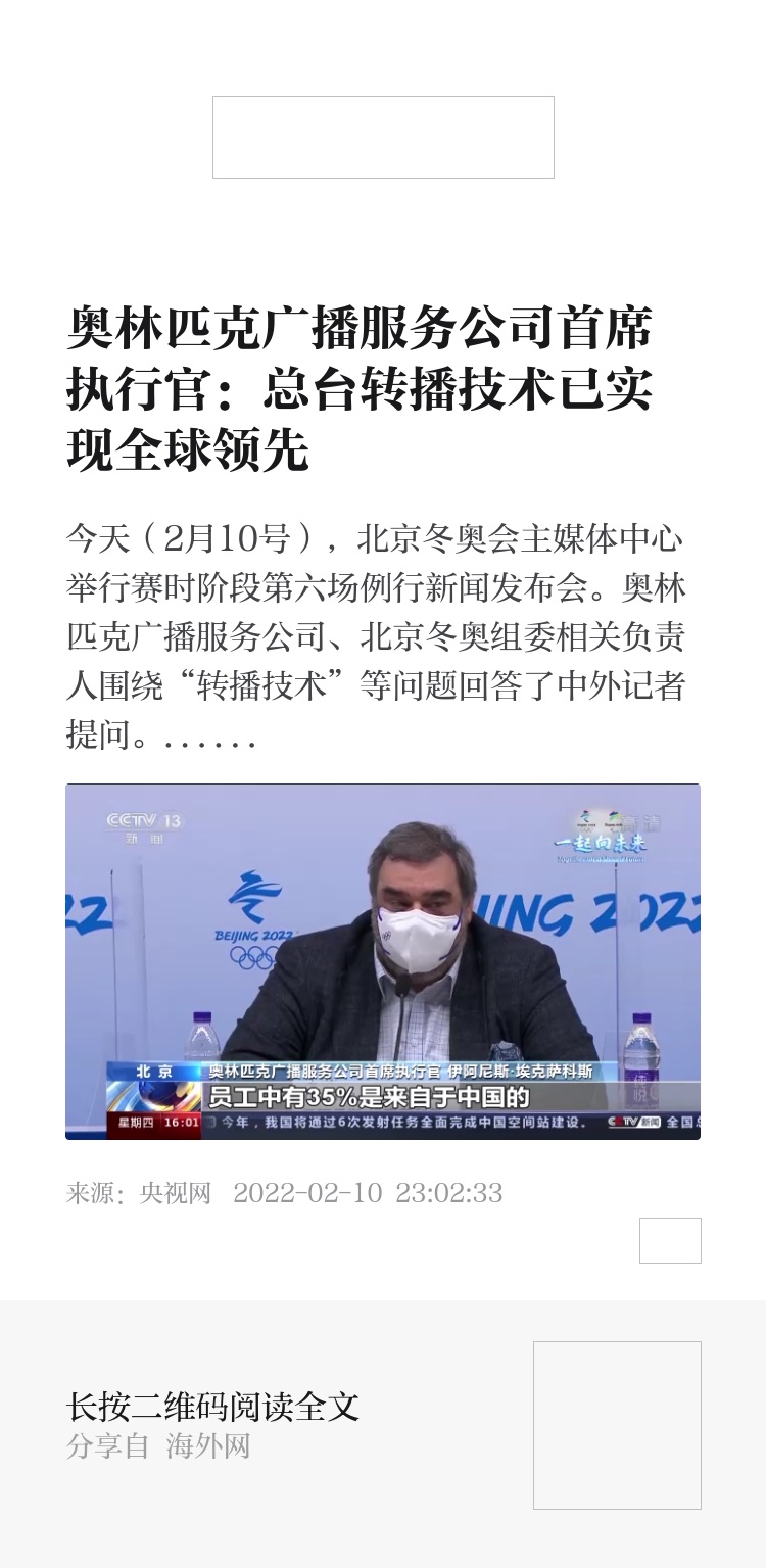 总台记者 翟壮:例行发布会上,奥林匹克广播服务公司首席执行官提到,截至目前,本届冬奥会的全球收视份额,已经创造了历届冬奥会的新高。同时他也提到了作为合作伙伴的中央广播电视总台,他认为,在奥运会的历史上,总台首次实现赛事全程4K制作播出,并在开幕式提供了8K超高清公共信号,这都说明总台在转播技术方面已经实现了全球领先。