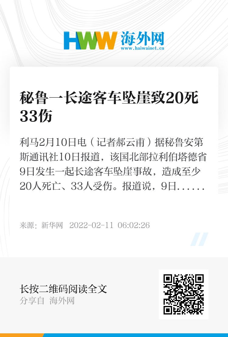 新华社利马2月10日电(记者郝云甫)据秘鲁安第斯通讯社10日报道,该国北部拉利伯塔德省9日发生一起长途客车坠崖事故,造成至少20人死亡、33人受伤。