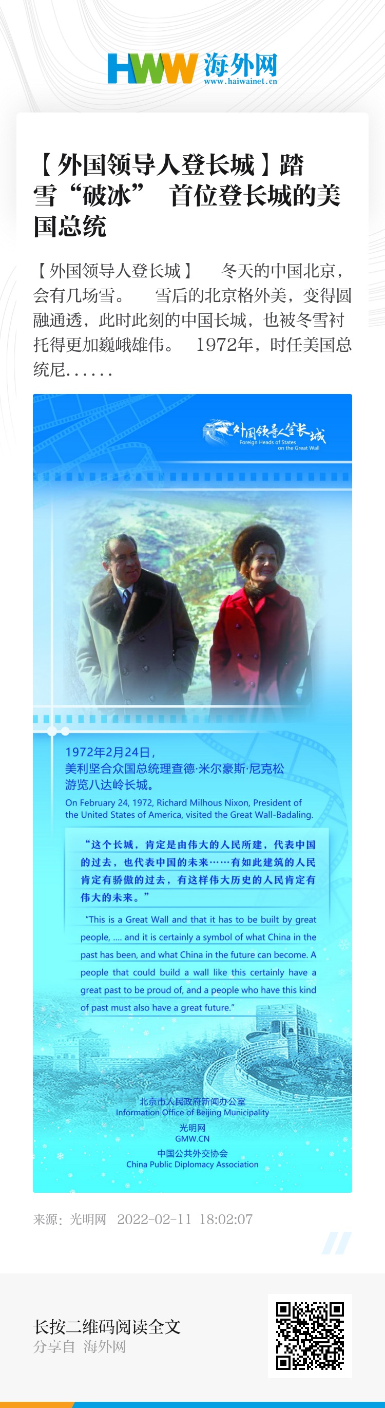 雪后的长城格外安静,尼克松和夫人站在位于中国北京的八达岭长城之上,头顶穹庐,极目远望,四周寂静。望着远处的山峰,尼克松说道:“我们到了长城,成为毛泽东主席说的‘好汉’了!”