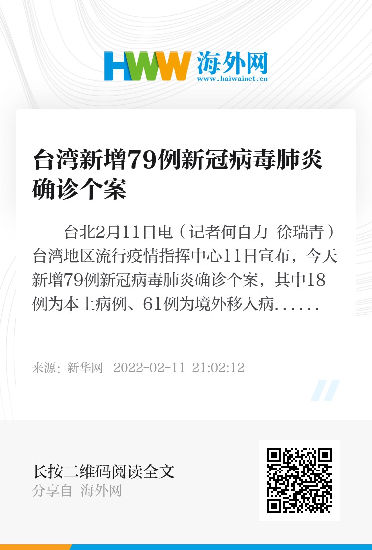 新华社台北2月11日电(记者何自力 徐瑞青)台湾地区流行疫情指挥中心11日宣布,今天新增79例新冠病毒肺炎确诊个案,其中18例为本土病例、61例为境外移入病例,没有新增死亡个案。