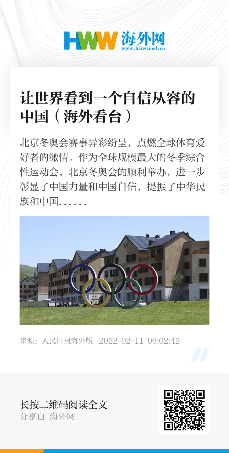 疫情之下,北京冬奥会能够顺利举办,不仅给全球带来了一种共克时艰的坚定力量,也让世界看到更加自信从容的中国。