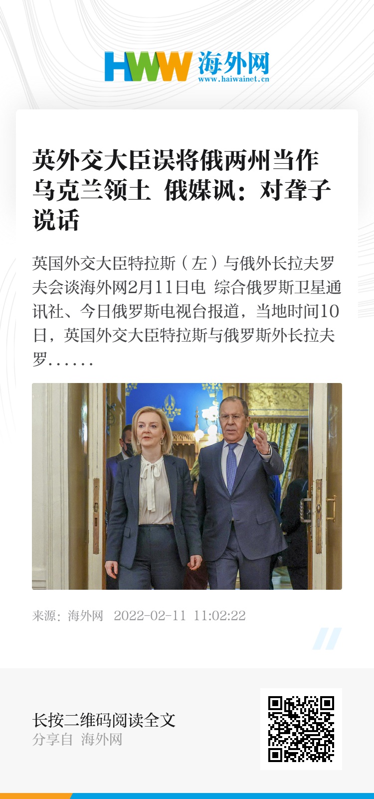 海外网2月11日电 综合俄罗斯卫星通讯社、今日俄罗斯电视台报道,当地时间10日,英国外交大臣特拉斯与俄罗斯外长拉夫罗夫在莫斯科会谈时闹出了大笑话,误将俄罗斯的罗斯托夫州和沃罗涅日州当作乌克兰领土。