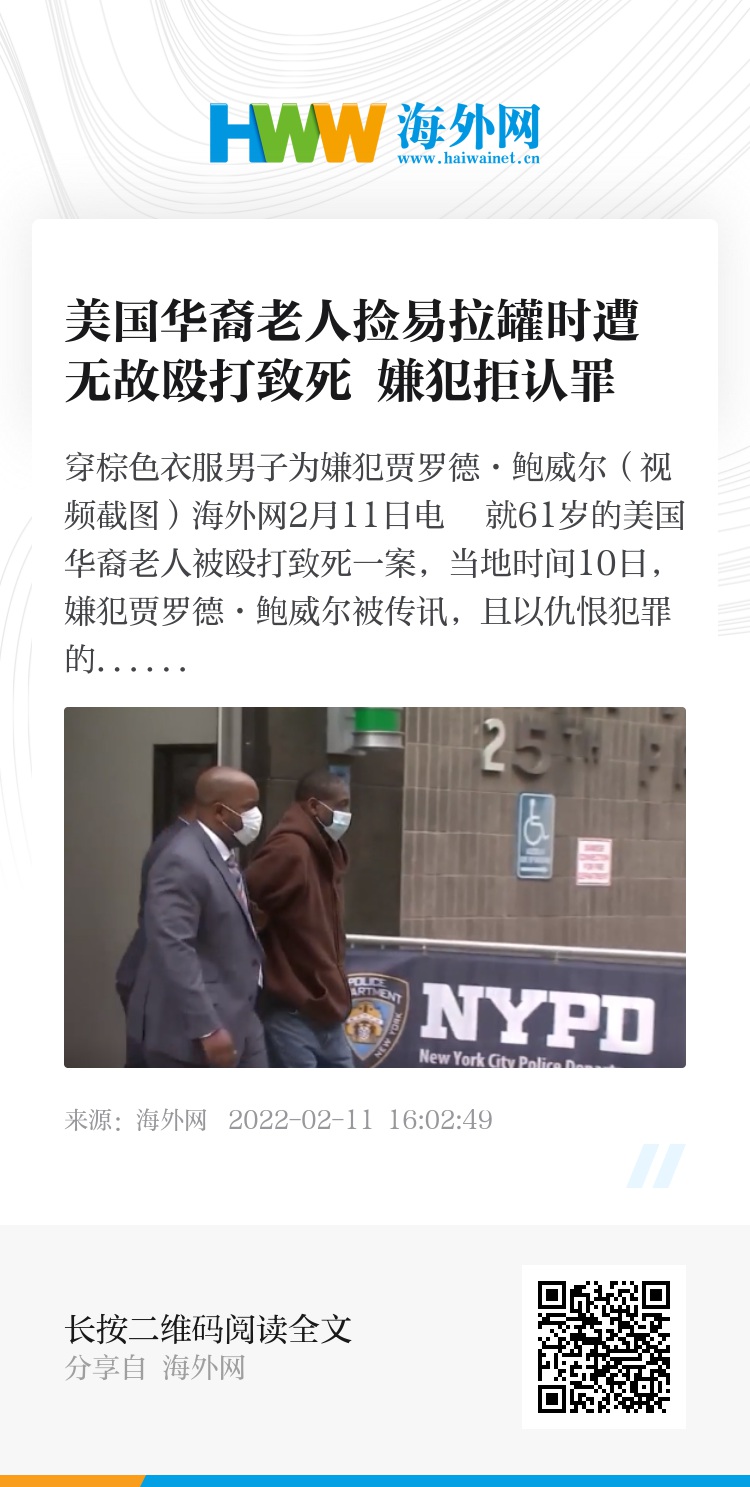 海外网2月11日电 就61岁的美国华裔老人被殴打致死一案,当地时间10日,嫌犯贾罗德·鲍威尔被传讯,且以仇恨犯罪的罪名被起诉。不过,鲍威尔在庭上拒不认罪。