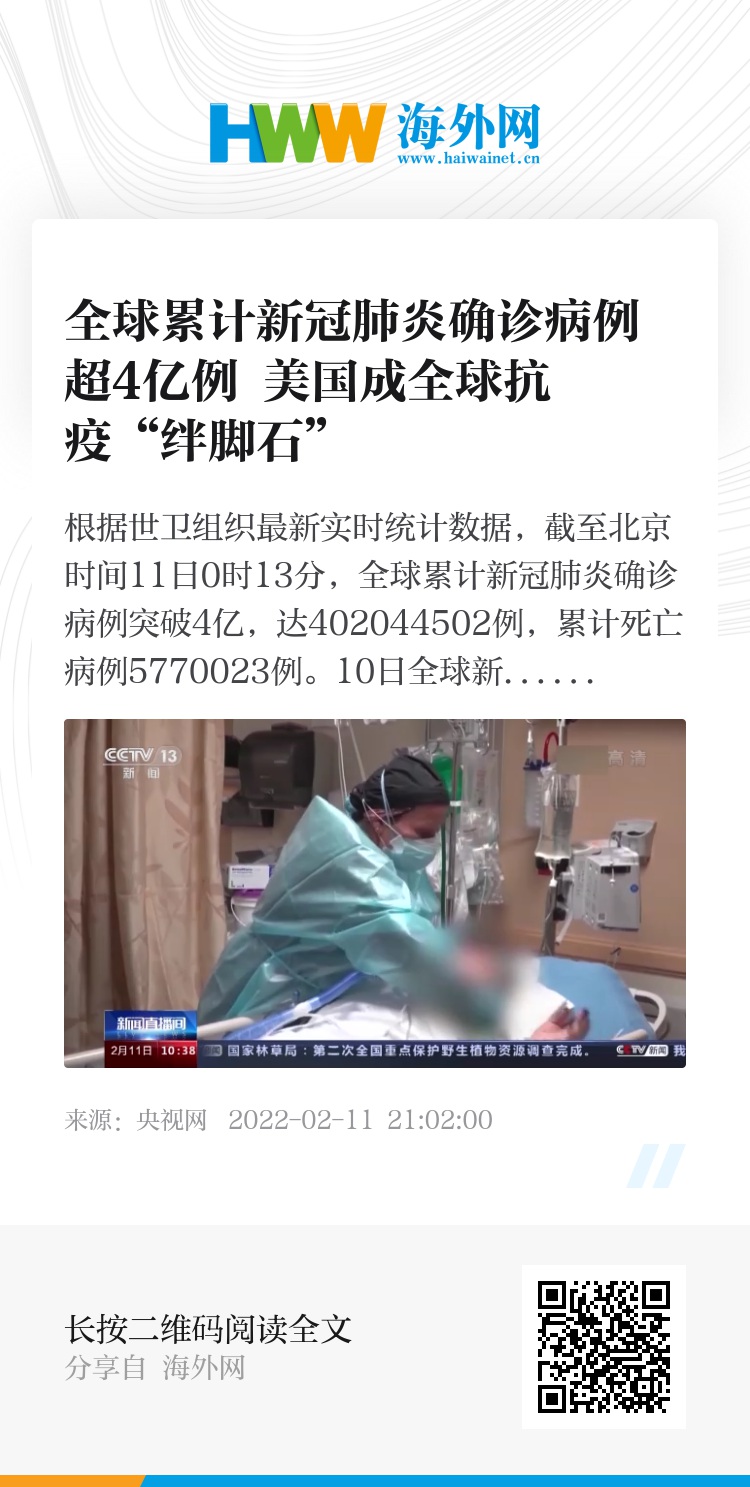根据世卫组织最新实时统计数据,截至北京时间11日0时13分,全球累计新冠肺炎确诊病例突破4亿,达402044502例,累计死亡病例5770023例。10日全球新冠肺炎确诊病例新增2332592例,死亡病例新增12005例。