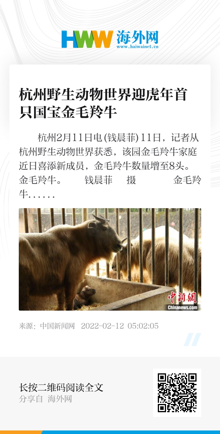 中新网杭州2月11日电(钱晨菲)11日,记者从杭州野生动物世界获悉,该园金毛羚牛家庭近日喜添新成员,金毛羚牛数量增至8头。