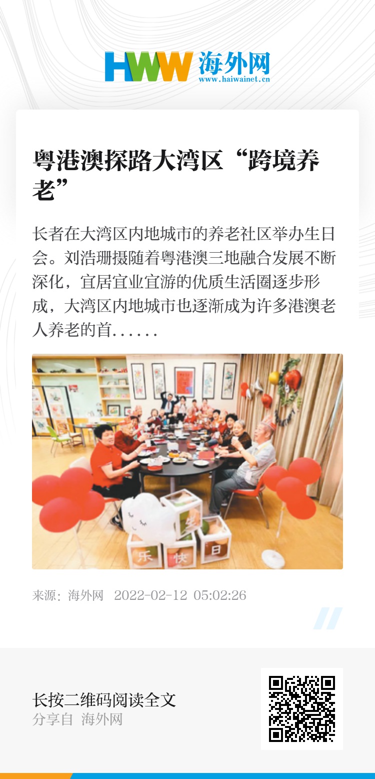 随着粤港澳三地融合发展不断深化,宜居宜业宜游的优质生活圈逐步形成,大湾区内地城市也逐渐成为许多港澳老人养老的首选之地。业内专家认为,在“跨境养老”方面,港澳和大湾区内地城市有着广阔的合作空间,内地有着丰富的土地和人力资源,港澳则有先进的医疗条件和丰富的社会养老服务经验,两者优势互补发挥协同效应,不仅有利于满足港澳社会日益增长的养老需求,而且还将激活大湾区医疗养老产业,互利共赢。