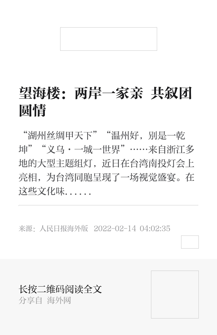 春节、元宵节是中华民族传统佳节,是万家团圆的喜庆时刻。两岸一家亲,共叙团圆情。今年元宵节前后,两岸民间继续上演精彩纷呈的灯会交流活动。你瞧,南投灯会上,浙江组灯出彩亮相;台北灯会上,照例设立上海花灯展区;江苏南京市与台湾新北市,线上举办2022两岸同贺新春“云点灯”活动;福建厦门市正在举办的两岸灯会,富有浓郁的闽台文化韵味……样式丰富的花灯,展示了各地历史文化、风土人情、城市地标,深化了两岸文化艺术交流,增进了两岸同胞情感共鸣。