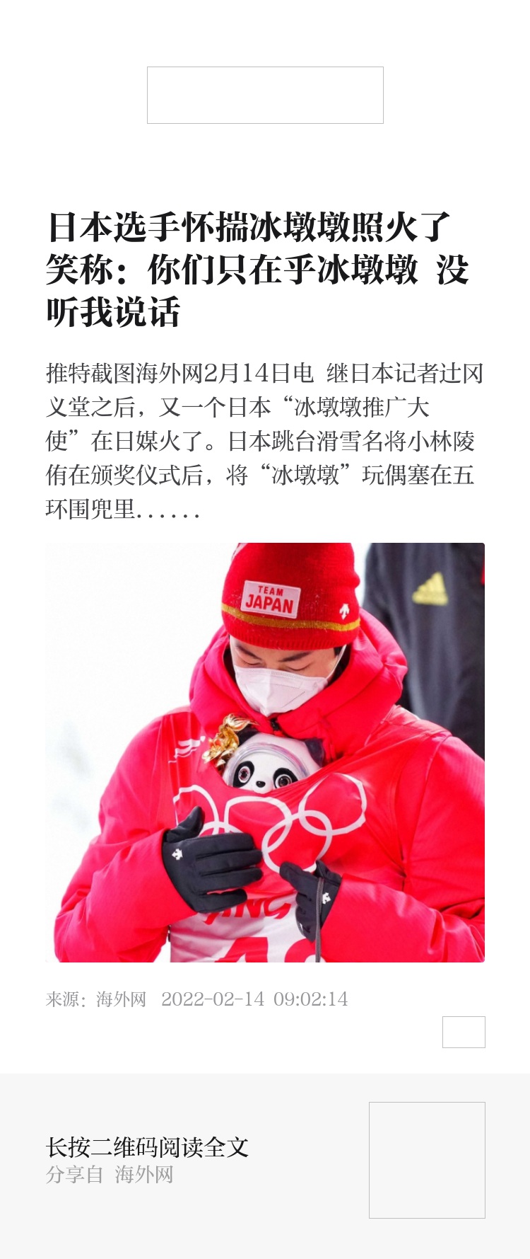 2月12日晚,日本运动员小林陵侑在北京冬奥会跳台滑雪男子个人大跳台决赛中获得银牌。而几天前,小林刚刚在个人标准台决赛上夺金,为日本代表队拿下首金。赛后采访时,他如袋鼠一般将“冰墩墩”揣在怀里的样子引发网络热议。国际奥委会官方推特也发布了他的图片,还配了一个袋鼠的表情。