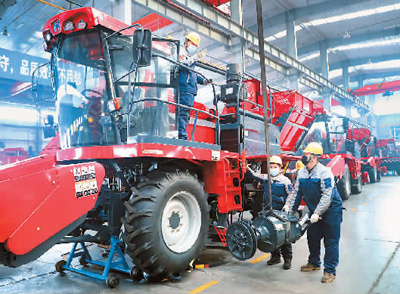 位于乌鲁木齐经济技术开发区(头屯河区)的新疆新研牧神科技有限公司春节假期过后恢复生产,该公司1月以来已经接到各类农机产品订单1300余台。图为日前,员工在车间组装玉米收获机。张秀科摄(人民视觉)
