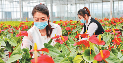 近年来,黑龙江省甘南县兴十四村农业生产实现现代化、标准化作业,同时引进鲜食玉米、粮食深加工、生物质发电等产业项目,持续增加村民收入。图为2月12日,该村现代农业示范园区花卉区内,技术人员在对花卉进行科学管护。宋燕军摄(人民视觉)