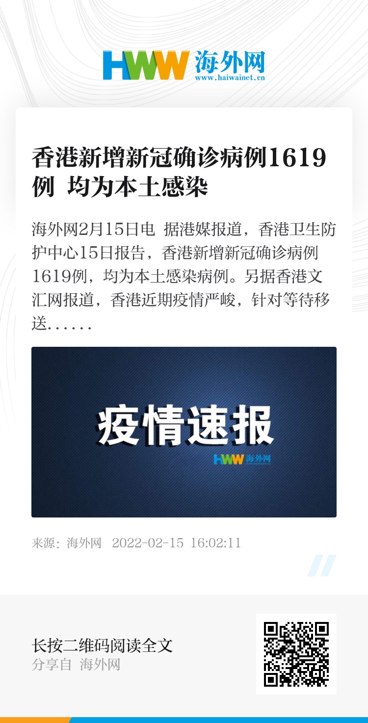 海外网2月15日电 据港媒报道,香港卫生防护中心15日报告,香港新增新冠确诊病例1619例,均为本土感染病例。