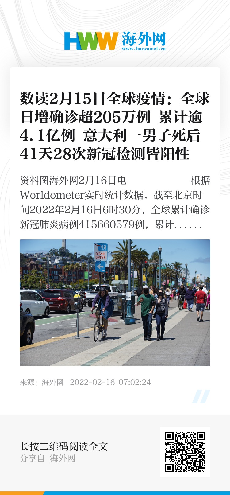 海外网2月16日电 根据Worldometer实时统计数据,截至北京时间2022年2月16日6时30分,全球累计确诊新冠肺炎病例415660579例,累计死亡病例5854010例。全球单日新增确诊病例2052394例,新增死亡病例12413例。