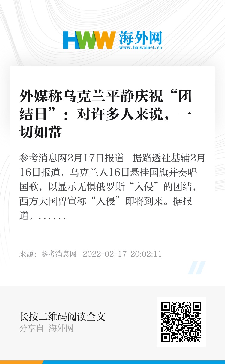 参考消息网2月17日报道 据路透社基辅2月16日报道,乌克兰人16日悬挂国旗并奏唱国歌,以显示无惧俄罗斯“入侵”的团结,西方大国曾宣称“入侵”即将到来。