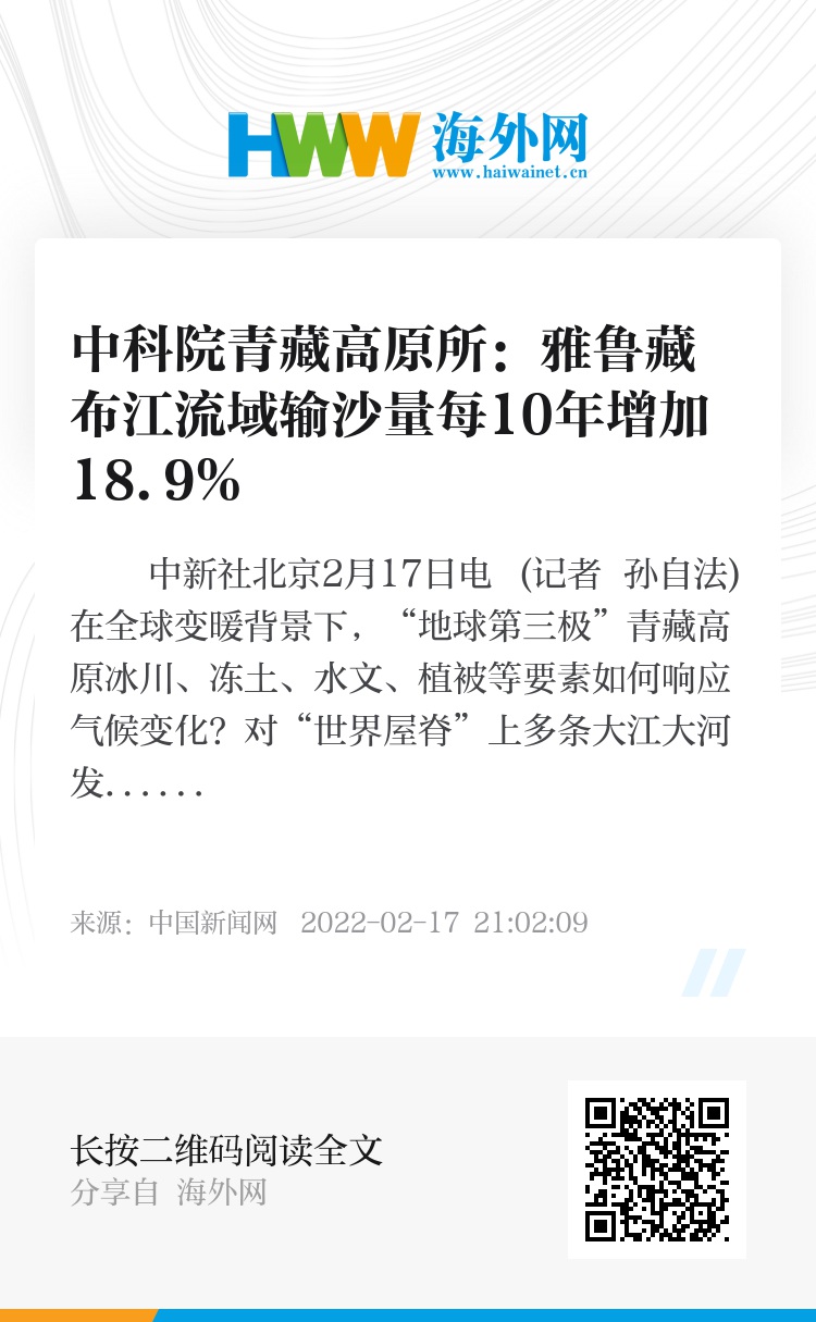 中国科学院青藏高原研究所(中科院青藏高原所)科研团队17日向媒体发布的一项最新研究表明,近几十年来,暖湿化气候推动青藏高原江河源区输沙量以增加趋势为主,雅鲁藏布江流域河流输沙量以每10年增加18.9%的变化率显著增加,且目前尚未检出突变拐点。