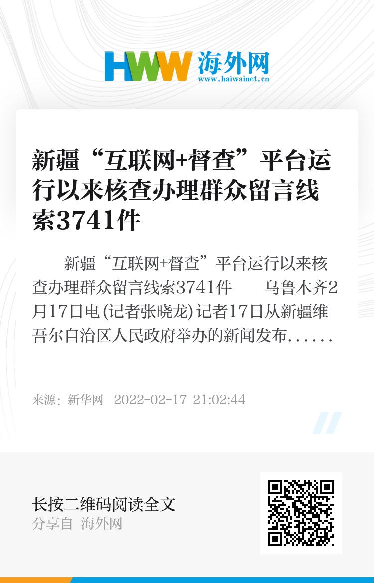 新华社乌鲁木齐2月17日电(记者张晓龙)记者17日从新疆维吾尔自治区人民政府举办的新闻发布会上了解到,自2021年1月1日新疆“互联网+督查”平台正式上线运行以来,共收到留言4100余条,核查办理群众留言线索3741件,解决群众困难1906个,惠及群众9.43万人。