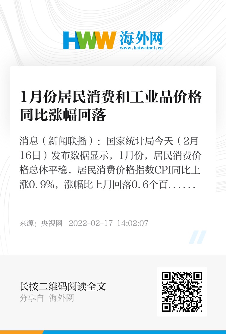 央视网消息(新闻联播):国家统计局今天(2月16日)发布数据显示,1月份,居民消费价格总体平稳,居民消费价格指数CPI同比上涨0.9%,涨幅比上月回落0.6个百分点。从环比看,受节日因素影响,鲜果、水产品和鲜菜价格上涨较为明显;非食品中,受国际能源价格上涨影响,汽油、柴油和液化石油气价格上涨。