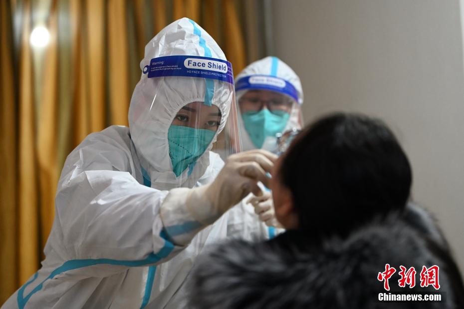 2月17日,呼和浩特市一小区的临时核酸检测点内,居民进行核酸检测。当日,呼和浩特市对重点区域人员启动核酸检测工作。中新社记者 刘文华 摄