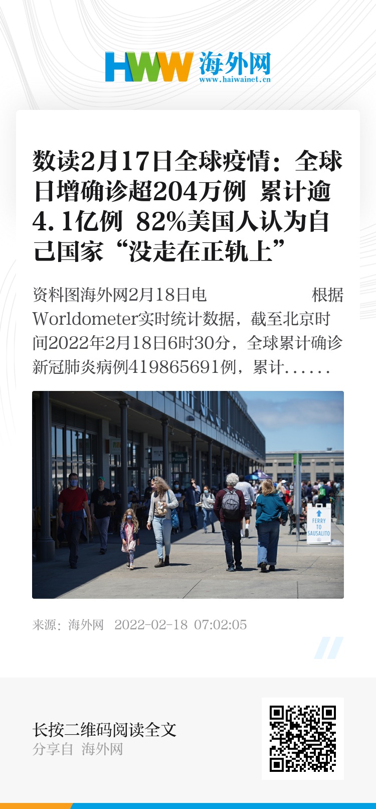 海外网2月18日电 根据Worldometer实时统计数据,截至北京时间2022年2月18日6时30分,全球累计确诊新冠肺炎病例419865691例,累计死亡病例5878501例。全球单日新增确诊病例2048639例,新增死亡病例12371例。