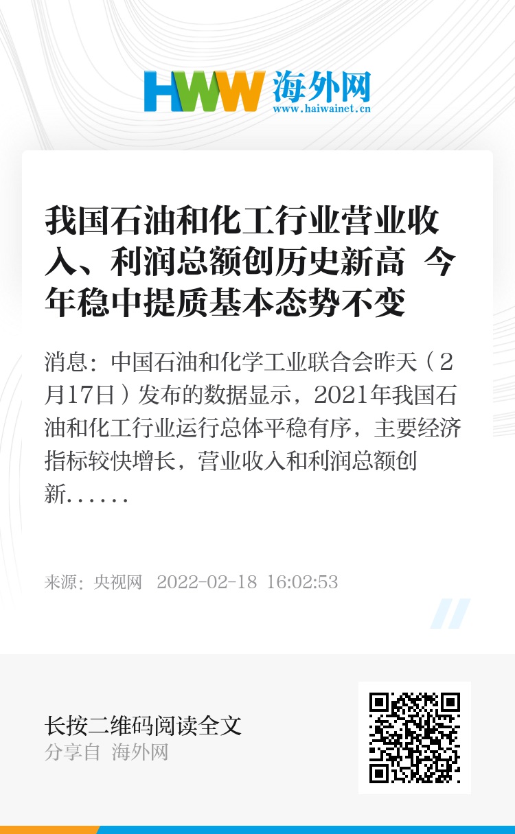 央视网消息:中国石油和化学工业联合会昨天(2月17日)发布的数据显示,2021年我国石油和化工行业运行总体平稳有序,主要经济指标较快增长,营业收入和利润总额创新高。