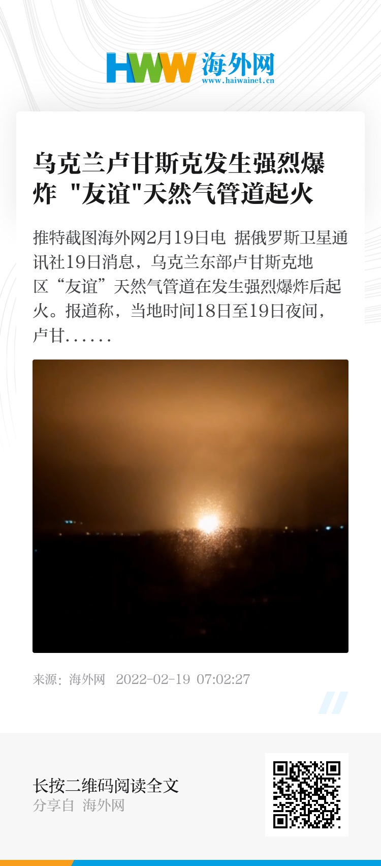 32345552,.乌克兰卢甘斯克发生强烈爆炸 "友谊"天然气管道起火,.2022-02-19 07:01:27,.204413,.王珊宁、张婧妍