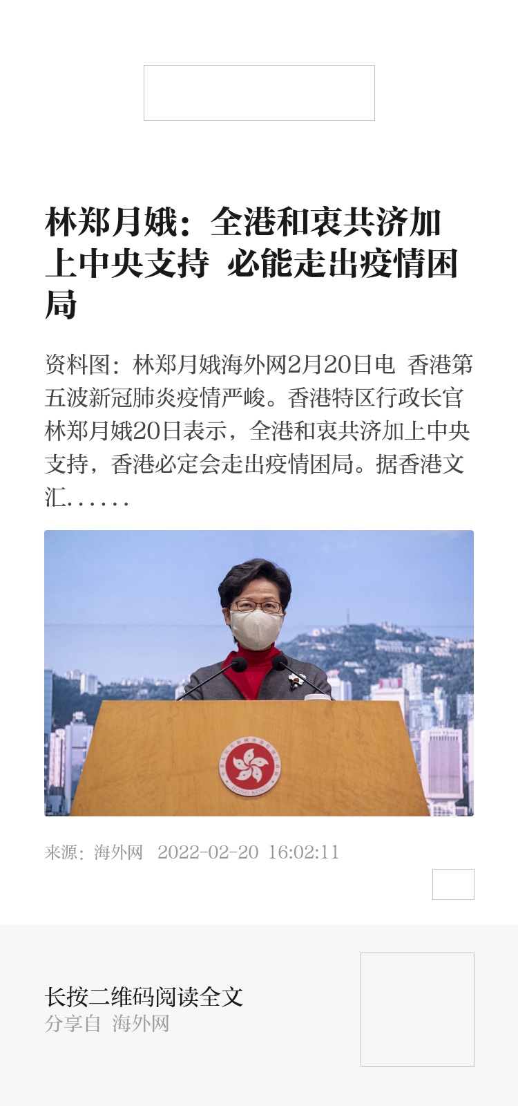 海外网2月20日电 香港第五波新冠肺炎疫情严峻。香港特区行政长官林郑月娥20日表示,全港和衷共济加上中央支持,香港必定会走出疫情困局。