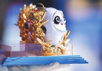 二月十六日,在北京冬奥会颁发纪念品仪式上拍摄的冰墩墩。新华社记者 薛玉斌摄