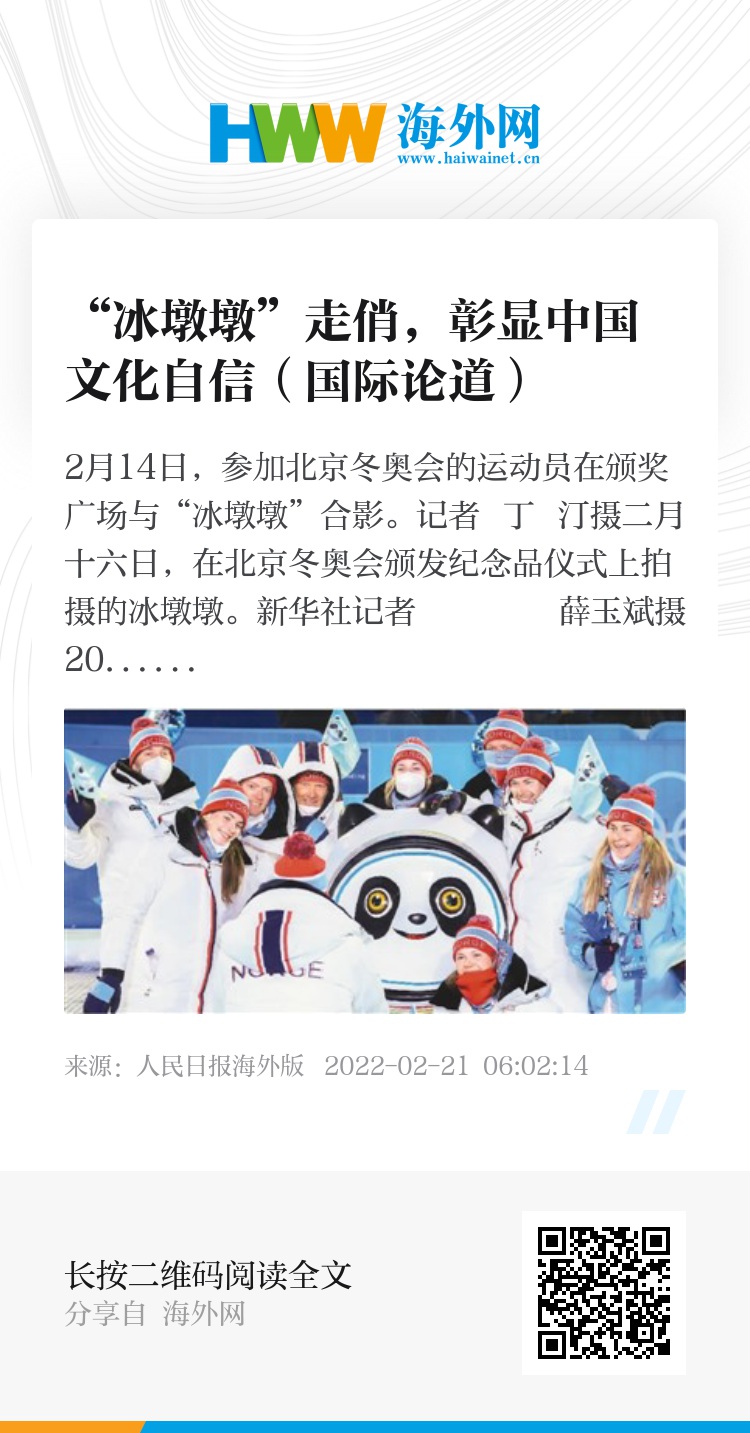 2月11日,《纽约时报》探访了位于北京市中心的奥运纪念品旗舰店,看到了长长的等待购买冬奥纪念品的队伍。报道引述一位北京居民说,中国的大人孩子都喜欢“冰墩墩”的设计,人们还在“冰墩墩”的受欢迎程度中发现了民族自豪感。“一个重要原因是国产品牌的崛起。我们为冬奥会开幕式感到骄傲。我们有文化自信。”(记者 贾平凡)