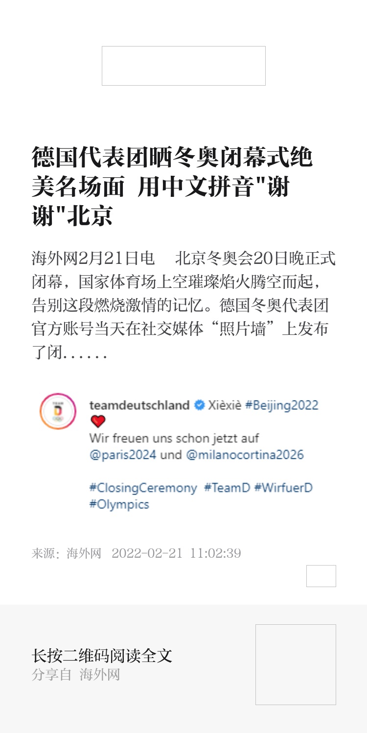 德国冬奥代表团官方账号20日发文写上“Xiè Xiè(谢谢)北京2022”,还表示已经开始期待2024年巴黎奥运会及2026年米兰-科尔蒂纳丹佩佐冬季奥运会了。