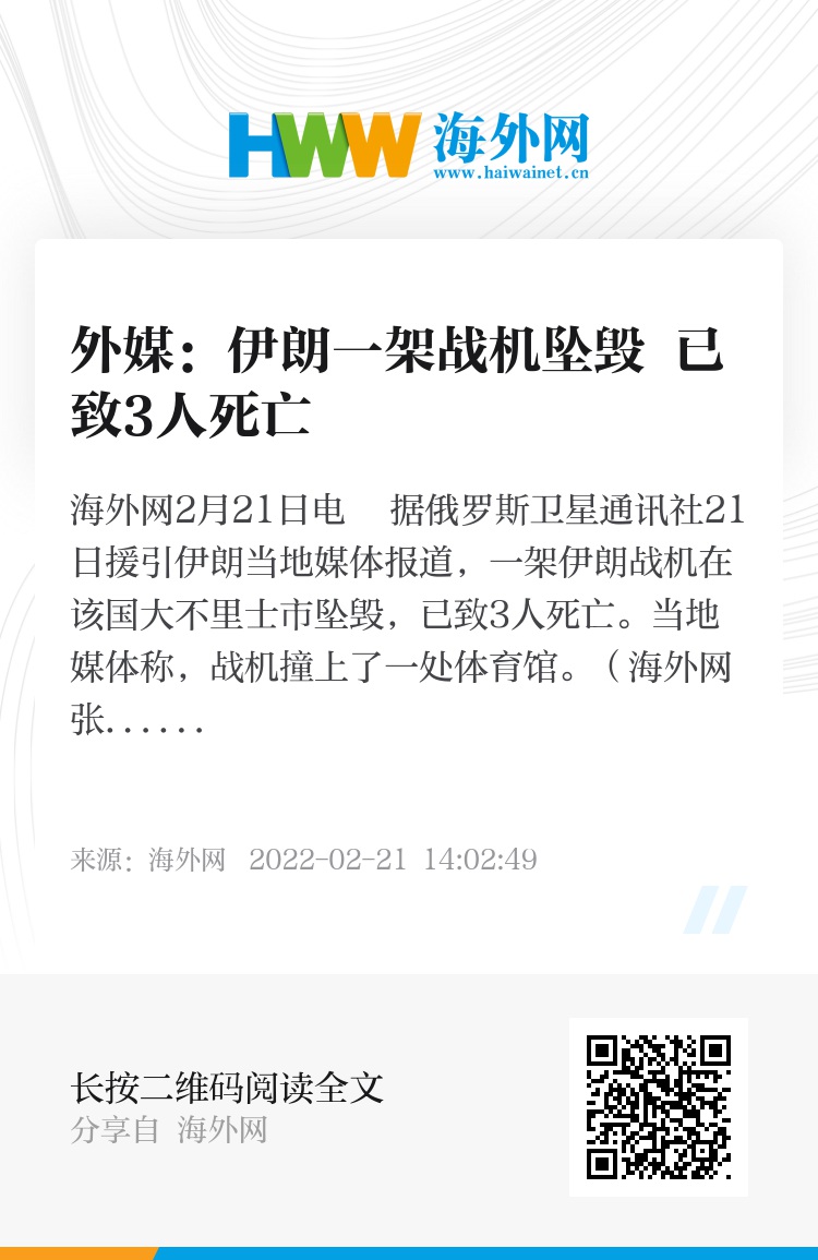 海外网2月21日电 据俄罗斯卫星通讯社21日援引伊朗当地媒体报道,一架伊朗战机在该国大不里士市坠毁,已致3人死亡。当地媒体称,战机撞上了一处体育馆。(海外网 张霓)