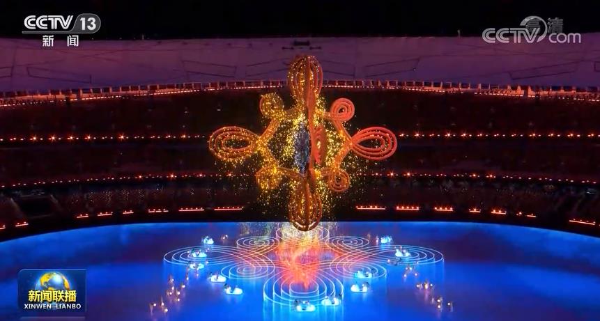 21时35分,2008年北京奥运会主题歌《我和你》的动人歌声再次响起,闪闪发光的奥运五环从场地中央升起。主火炬“大雪花”缓缓落下,在纯洁空灵的《雪花》歌声中,燃烧了16天的奥运之火渐渐熄灭。