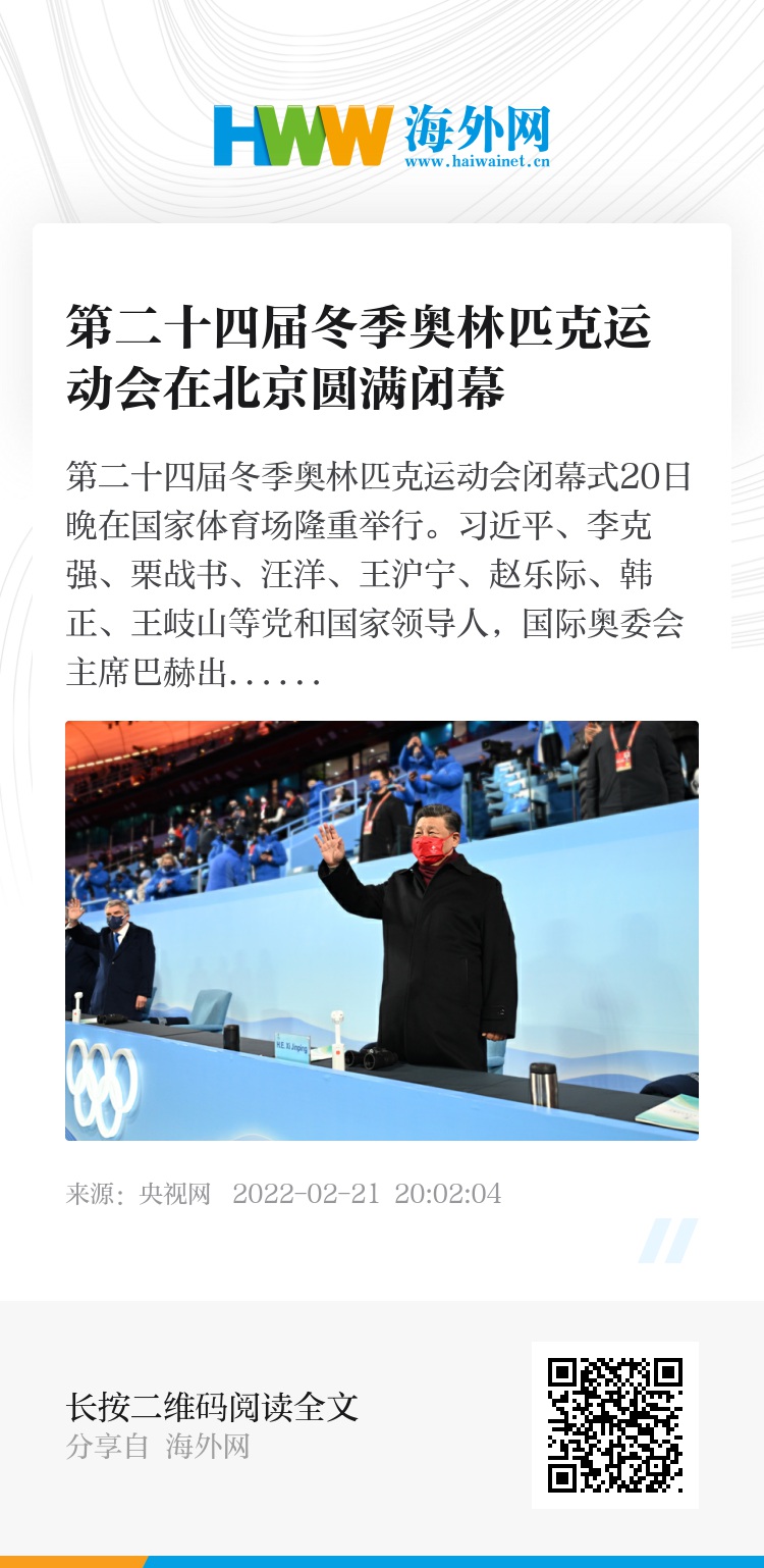 第二十四届冬季奥林匹克运动会闭幕式20日晚在国家体育场隆重举行。习近平、李克强、栗战书、汪洋、王沪宁、赵乐际、韩正、王岐山等党和国家领导人,国际奥委会主席巴赫出席闭幕式。