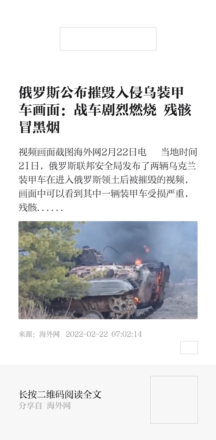 海外网2月22日电 当地时间21日,俄罗斯联邦安全局发布了两辆乌克兰装甲车在进入俄罗斯领土后被摧毁的视频,画面中可以看到其中一辆装甲车受损严重,残骸上冒着黑烟。