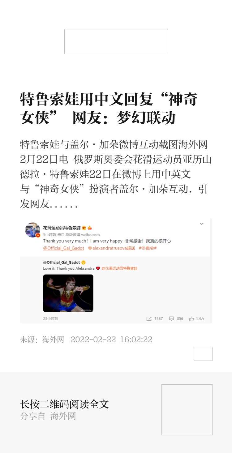 2月20日,特鲁索娃在冬奥会花样滑冰表演滑中惊艳亮相,变身冰上“神奇女侠”。“神奇女侠”的扮演者盖尔·加朵21日在微博上发文称赞这段表演,“很喜欢,谢谢亚历山德拉”。特鲁索娃22日也在微博上用中英文回复称,“非常感谢!我真的很开心”。