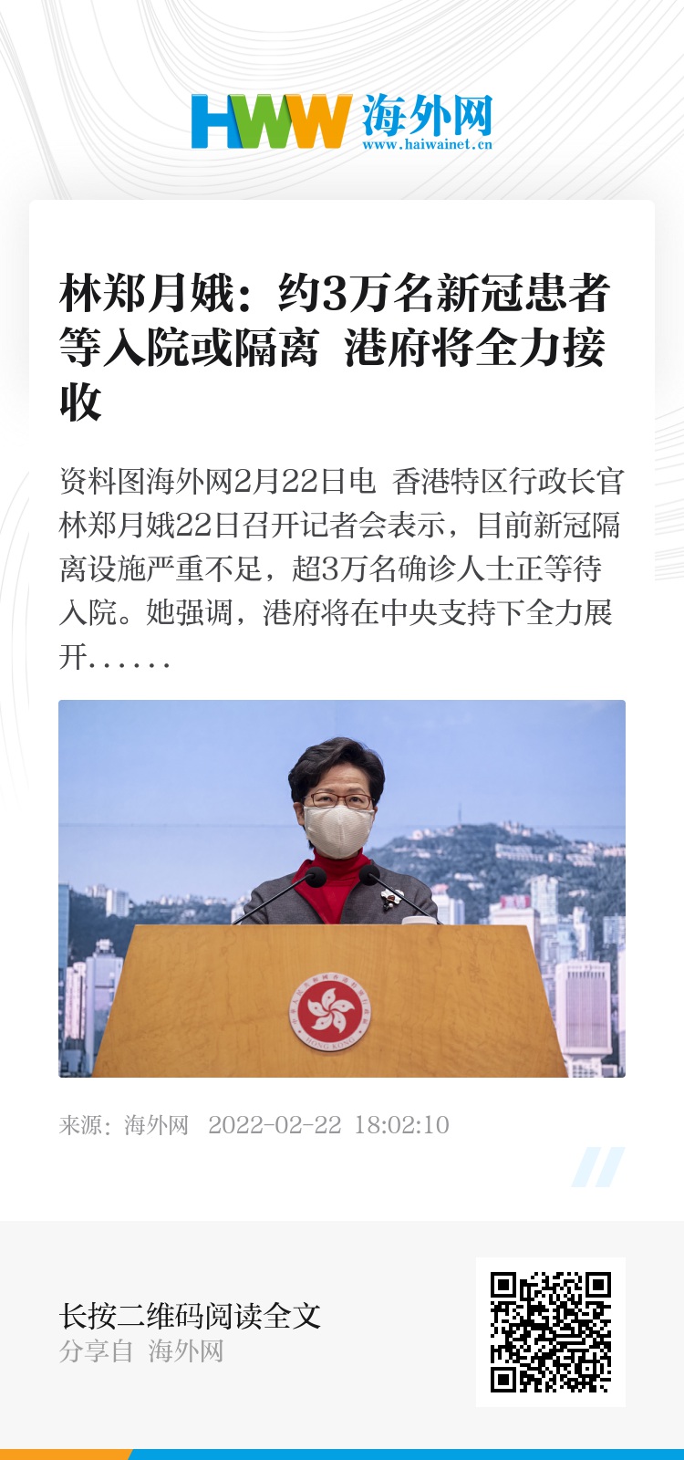海外网2月22日电 香港特区行政长官林郑月娥22日召开记者会表示,目前新冠隔离设施严重不足,超3万名确诊人士正等待入院。她强调,港府将在中央支持下全力展开接收工作。