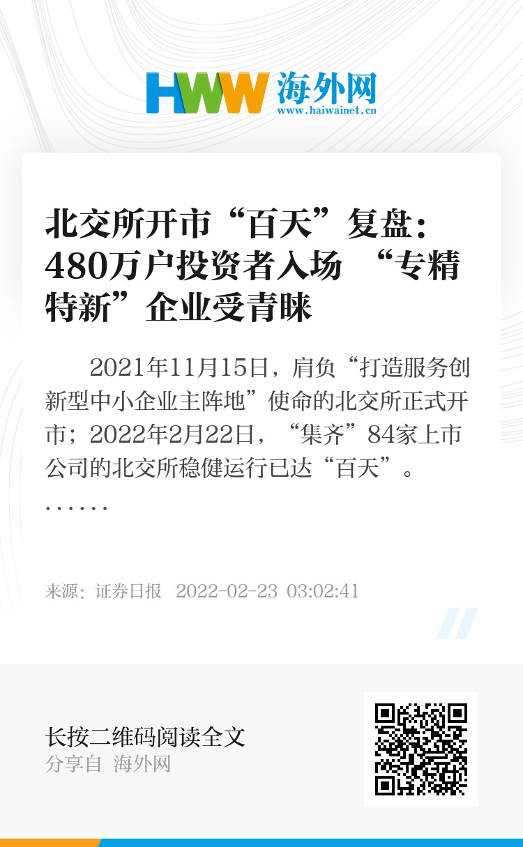2021年11月15日,肩负“打造服务创新型中小企业主阵地”使命的北交所正式开市;2022年2月22日,“集齐”84家上市公司的北交所稳健运行已达“百天”。