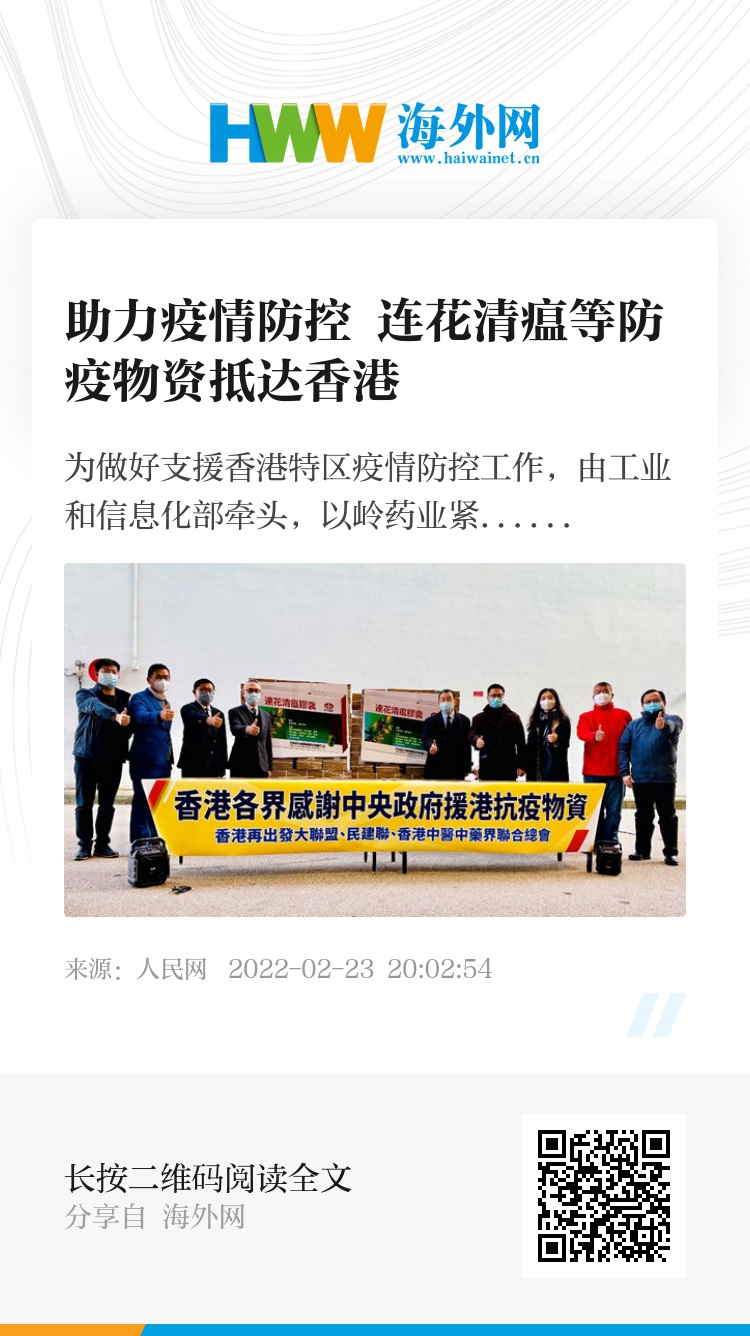 为做好支援香港特区疫情防控工作,由工业和信息化部牵头,以岭药业紧急生产调配,通过广东省钟南山医学基金会、中国人口福利基金会等机构捐赠价值1365万元(约合1680万港元)的防疫物资支持香港,其中包括20万盒连花清瘟胶囊和连花清咳片、连花呼吸健康包、连花清瘟抗菌抗病毒口罩。