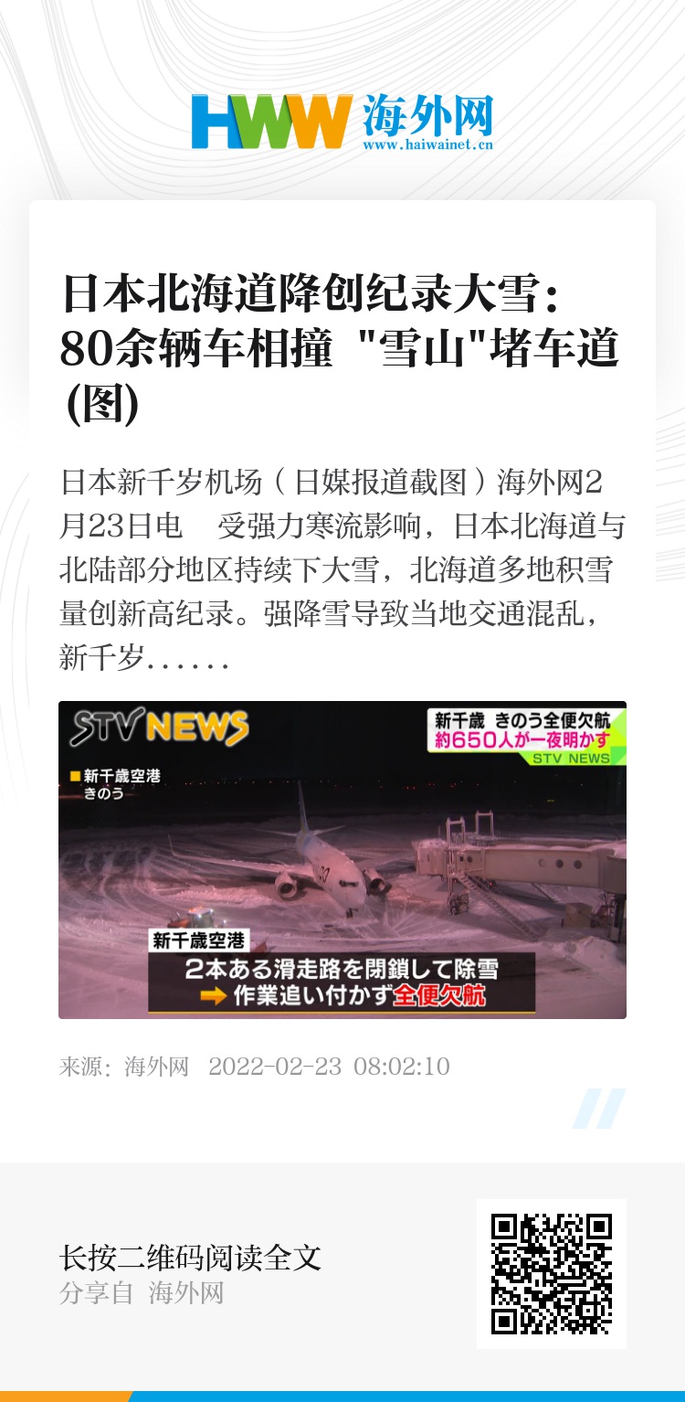 海外网2月23日电 受强力寒流影响,日本北海道与北陆部分地区持续下大雪,北海道多地积雪量创新高纪录。强降雪导致当地交通混乱,新千岁机场航班停飞,多趟电车停运,80余辆车接连相撞。