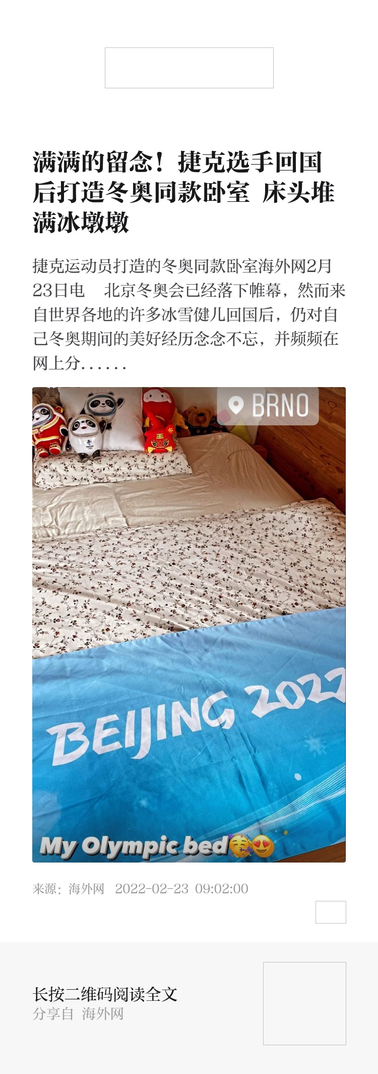 2月22日,塔施莱罗娃在海外社交平台“照片墙”上晒出照片,配文“我的奥运床”,定位是捷克的布尔诺市。从照片可以看到,她打造了一个冬奥村同款卧室:床尾铺着写有“北京2022”的床罩,床头则堆放了两个冰墩墩玩偶、一个冰墩墩抱枕、一个雪容融玩偶和一个布老虎,令整个房间都是冬奥村的回忆。